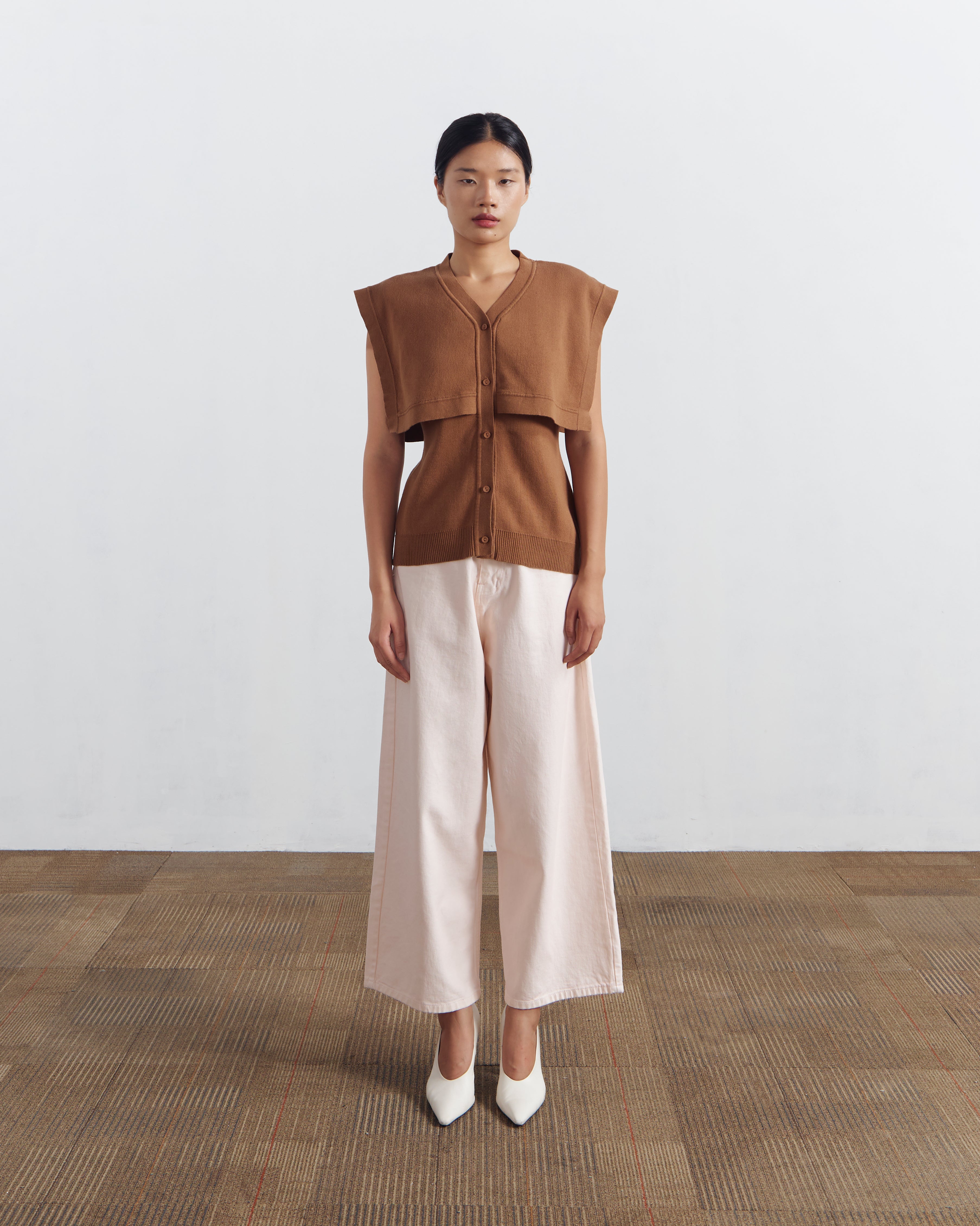 Sleeveless knitted vest with buttons opening, accentuated by shoulder cape panel.