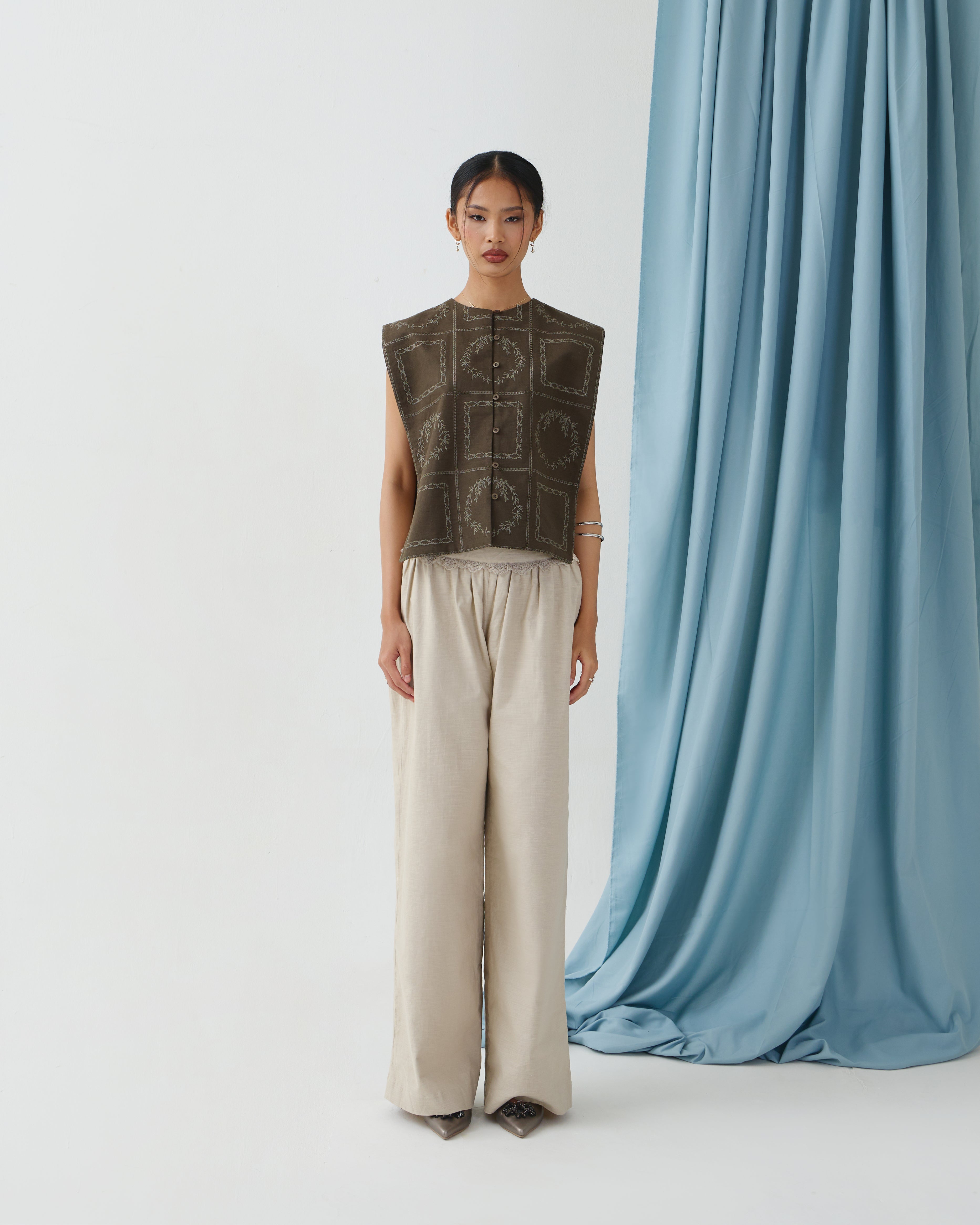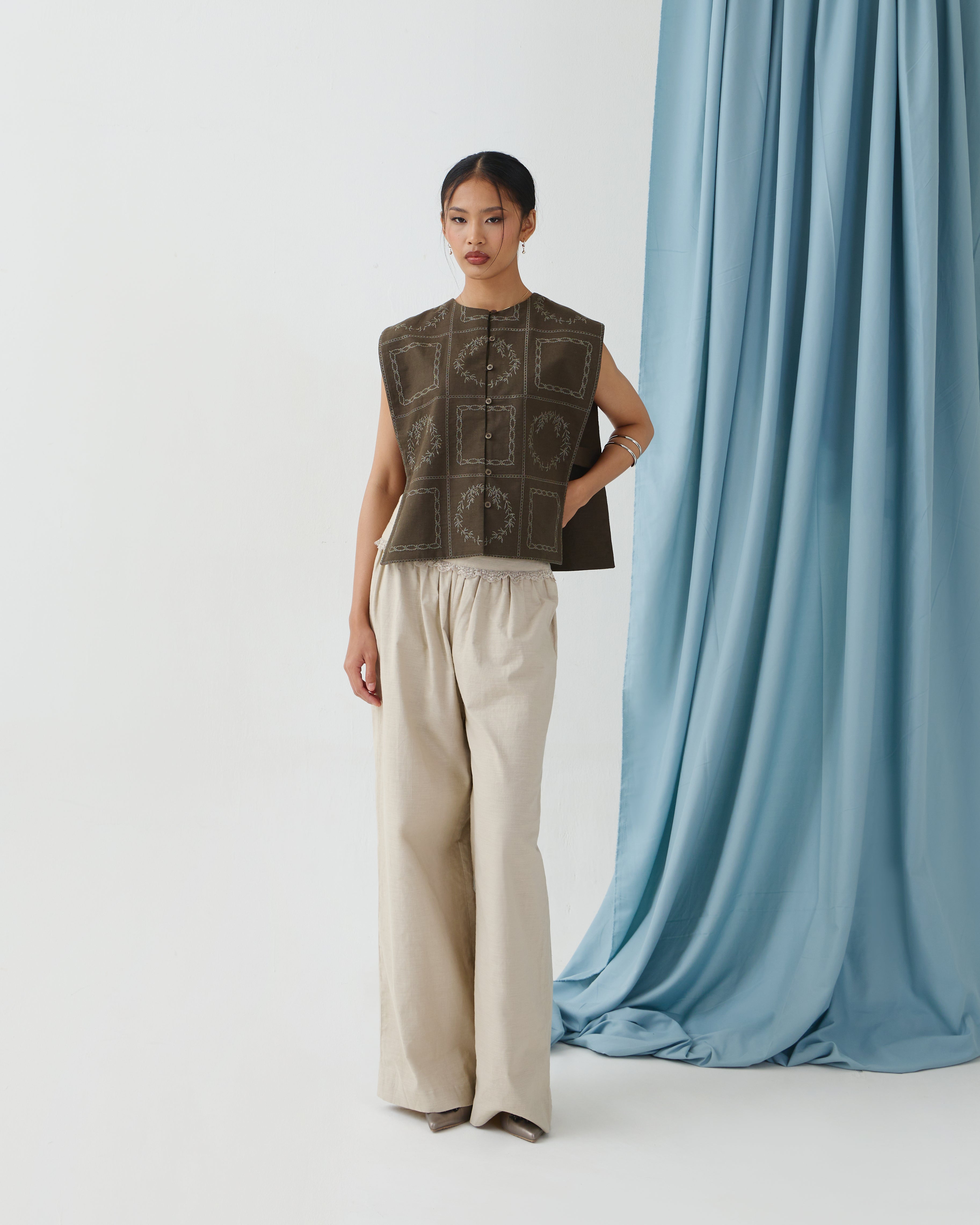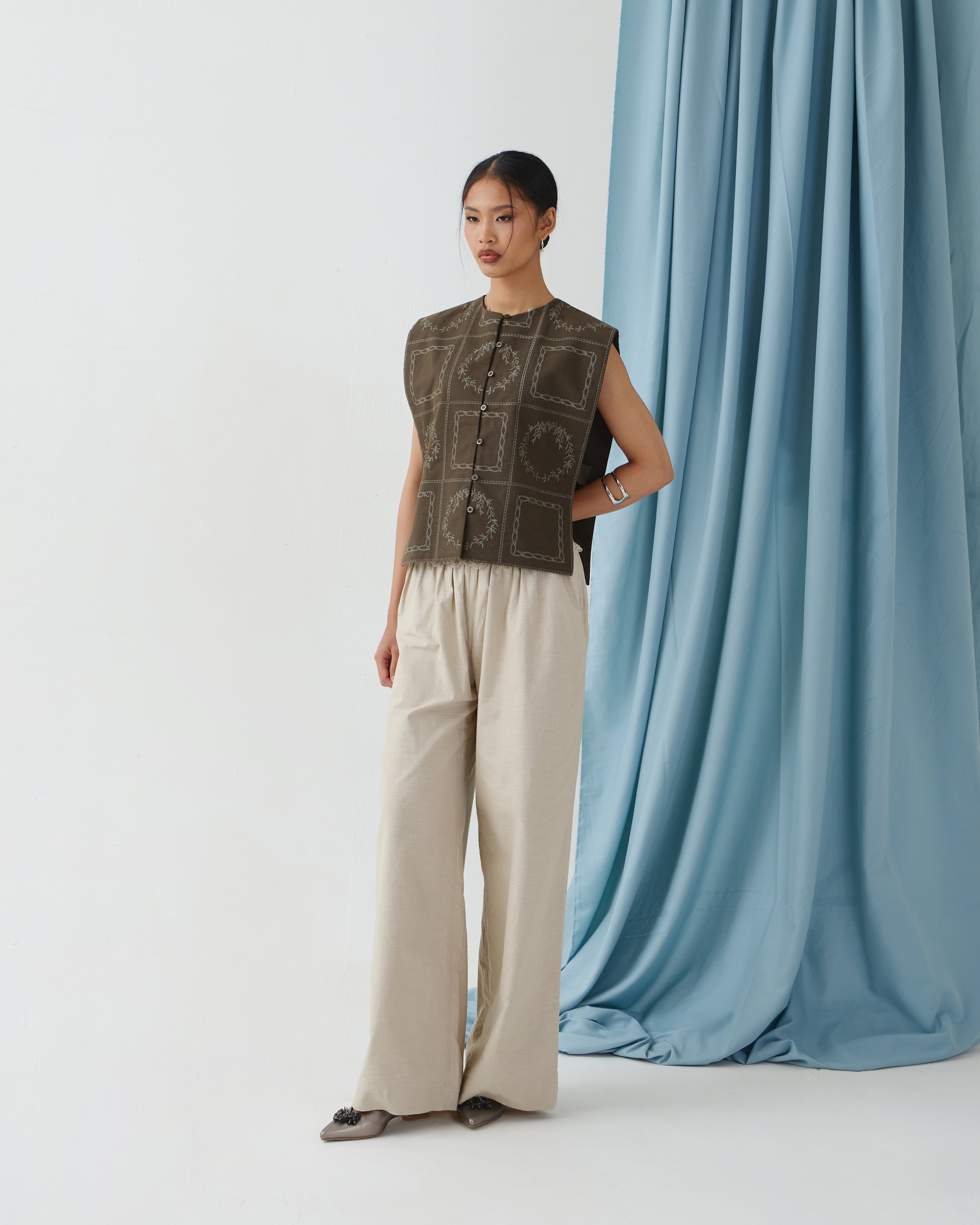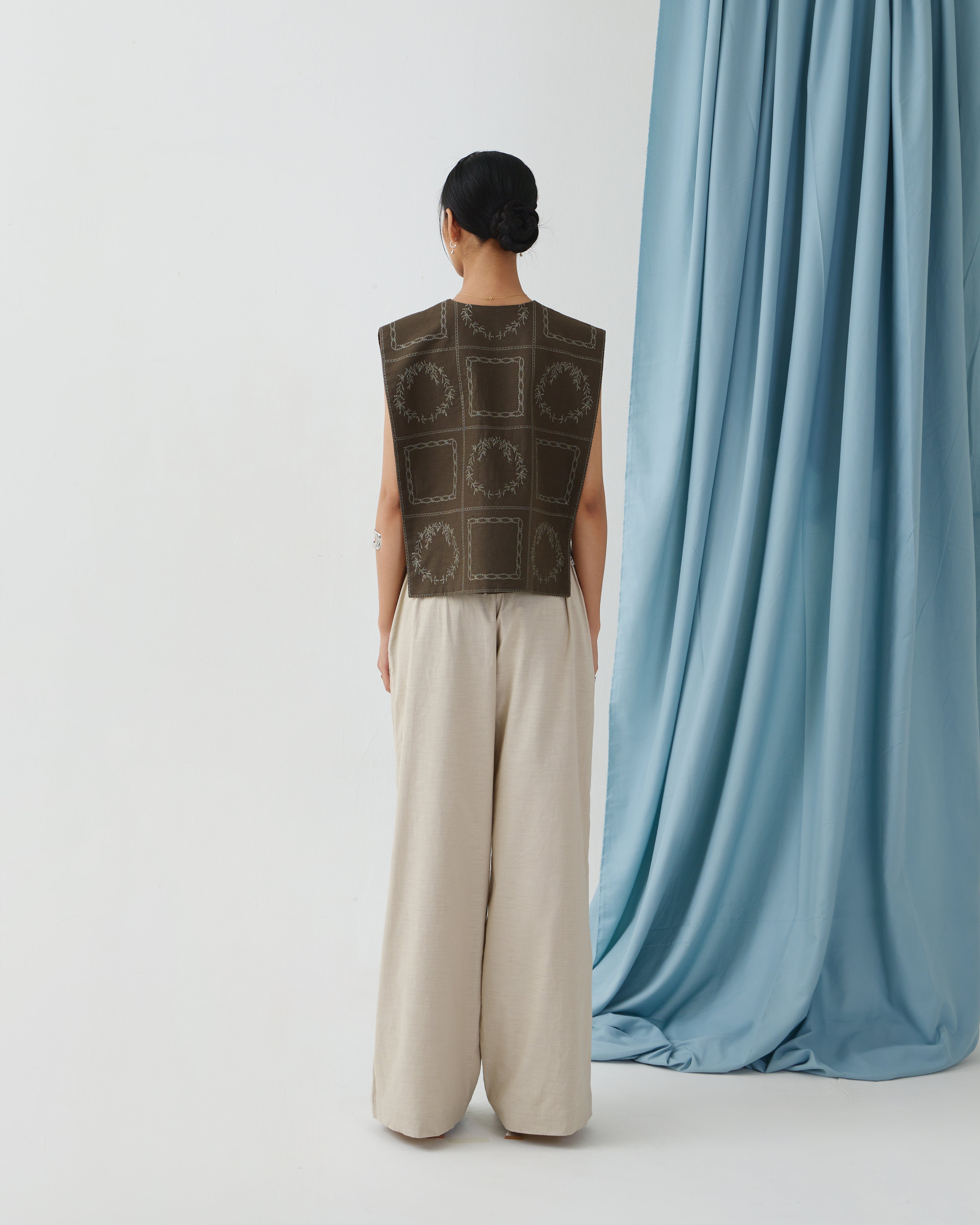 Short-length sleeveless vest in a cape-like design with buttons opening. Adorned with DULCET signature geometrical embroideries. Can be worn as a top or layering outerwear. Made from soft, fully natural mix of linen and cotton fabric.